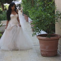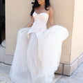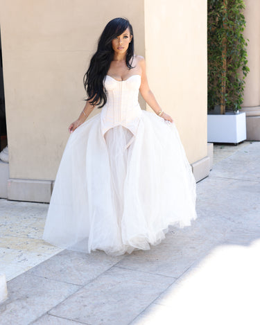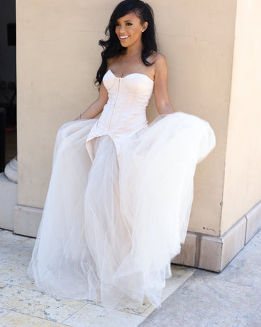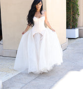 This stunning dress pairs a sculpted satin corset bodice with a voluminous, ethereal tulle skirt that floats with every step. The structured sweetheart neckline accentuates your curves while the dramatic high-low detail reveals just the right amount of leg, adding a modern edge to a fairytale silhouette.