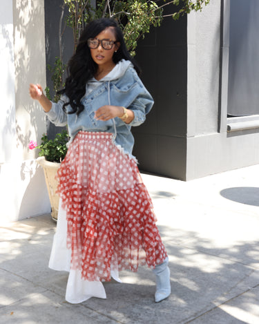 Step into a whimsical blend of texture and movement with the Gingham Daydream Maxi Skirt. This statement piece features cascading tiers of airy gingham mesh in a fresh coral-and-white palette, layered over a crisp white under-skirt for a look that’s both playful and polished. The asymmetric hemline adds dynamic flow with every step, while the elastic waistband ensures effortless comfort. Perfect for pairing with everything from oversized denim jackets to sleek bodysuits, this skirt turns sidewalks into runways and casual days into style moments.