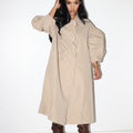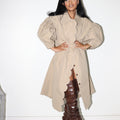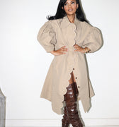 A timeless statement piece that blends classic tailoring with playful detailing. This trench-inspired dress is cut from a structured neutral-toned cotton, featuring voluminous puff sleeves, an exaggerated collar, and a flowing A-line silhouette. Its defining detail—a bold scalloped edge traced down the front placket and hem—adds a feminine, architectural touch to an otherwise minimalist design.