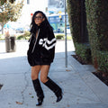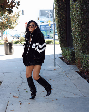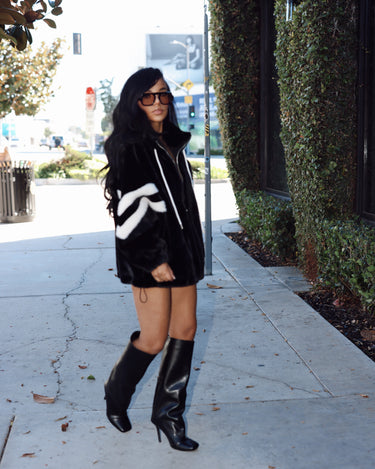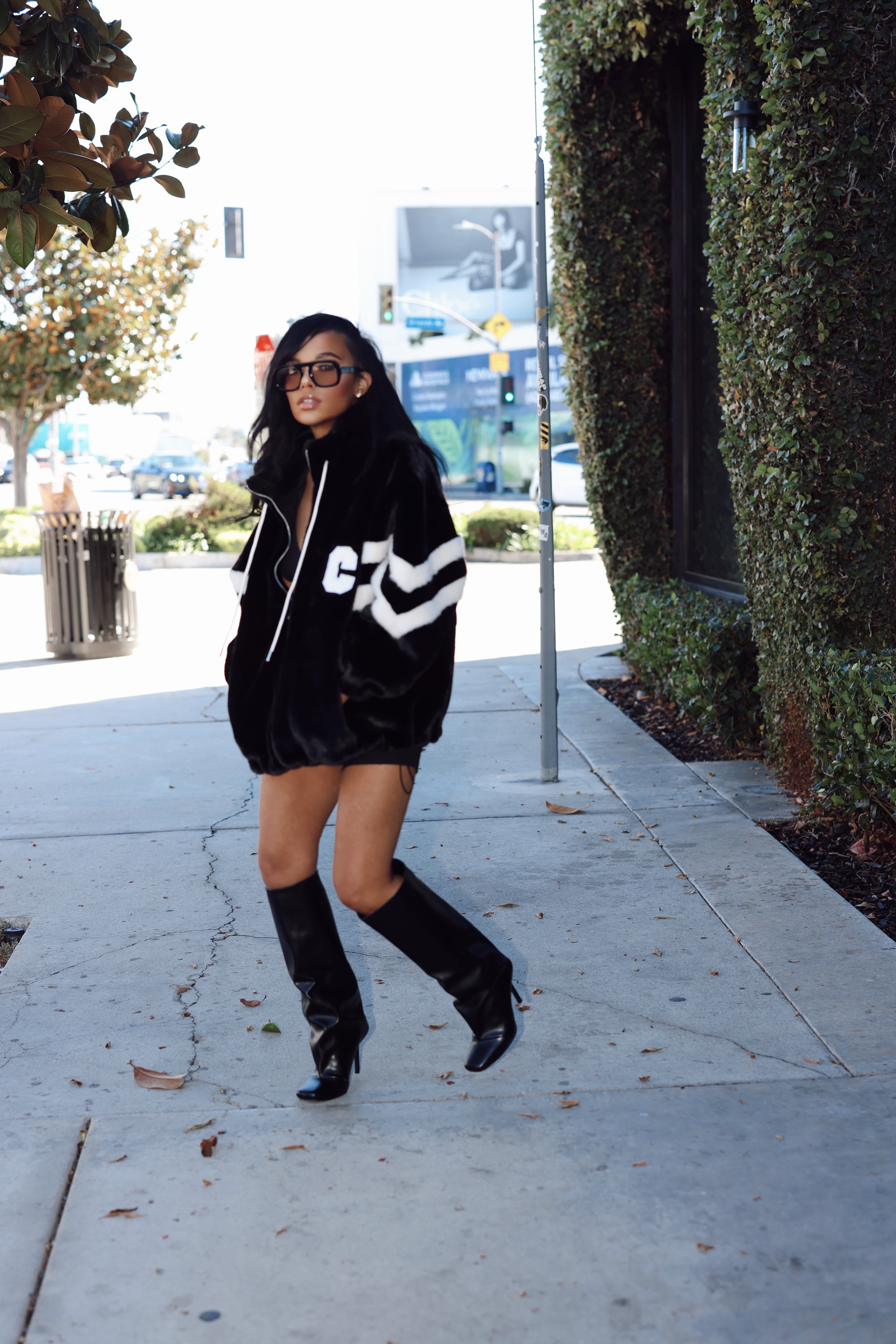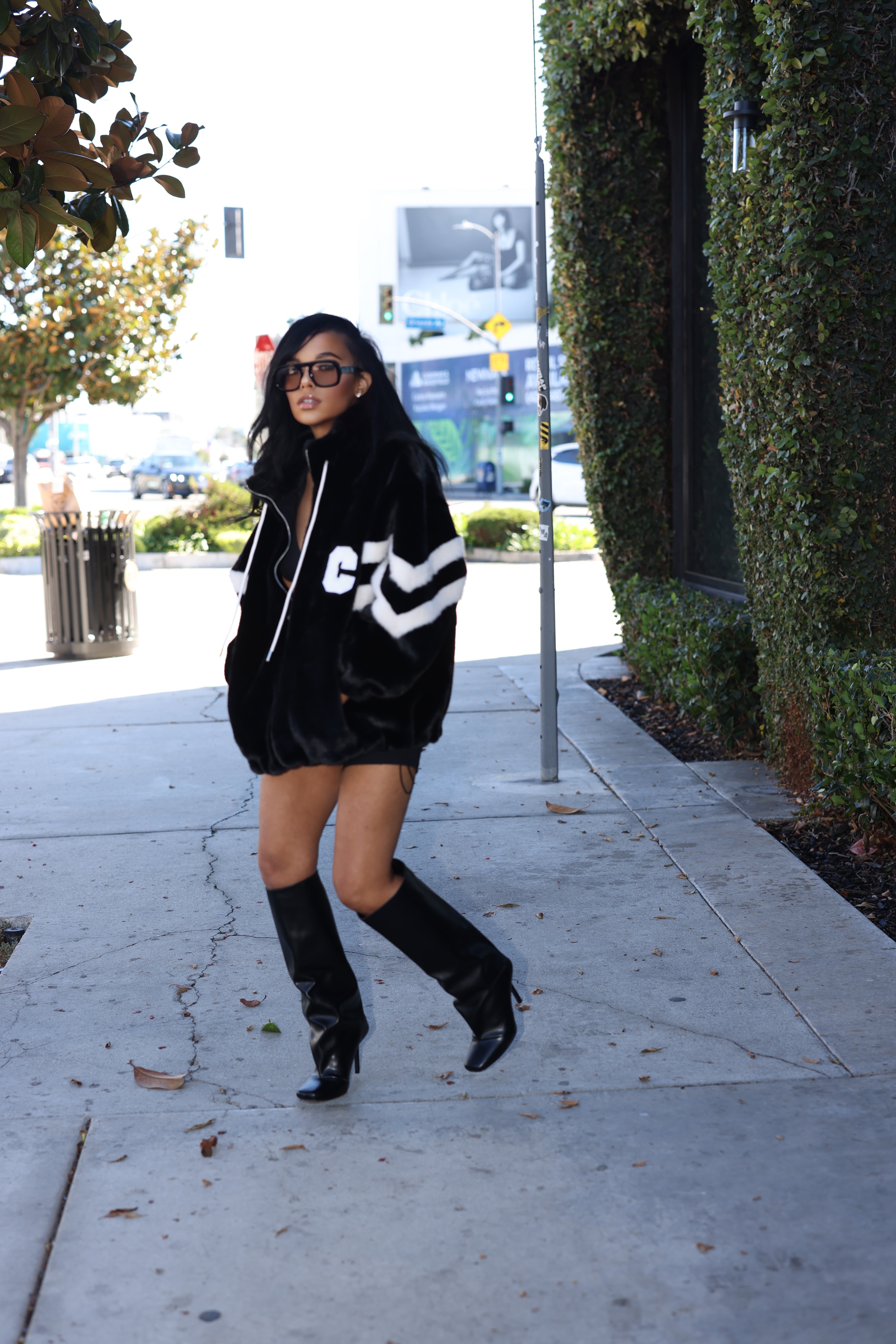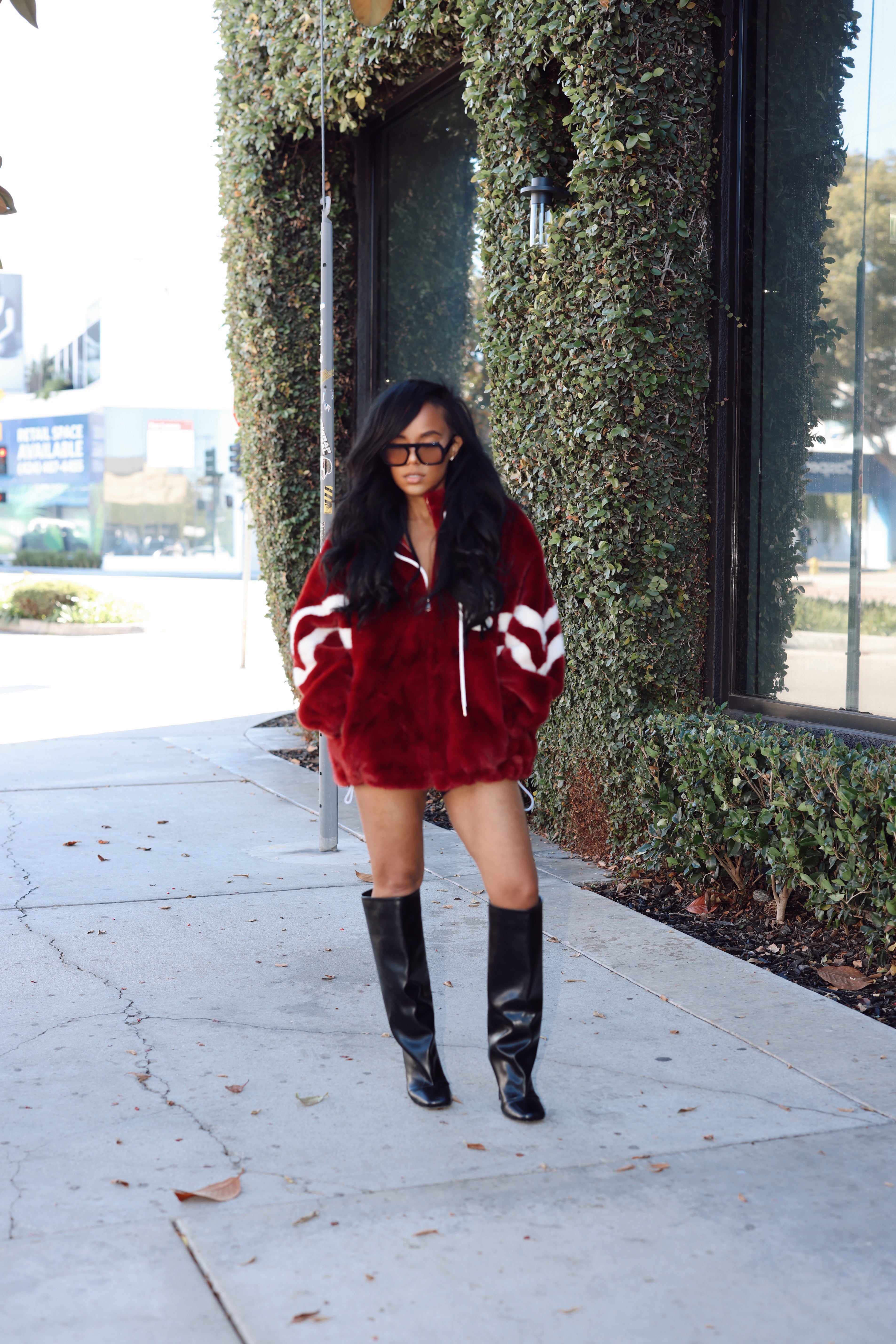 Command attention in the Varsity Luxe Fur Pullover — where bold street energy meets high-glam texture. Crafted in plush faux fur with sporty contrast stripes and an oversized fit, this statement piece blurs the line between off-duty and main-character energy.