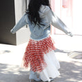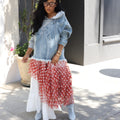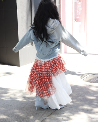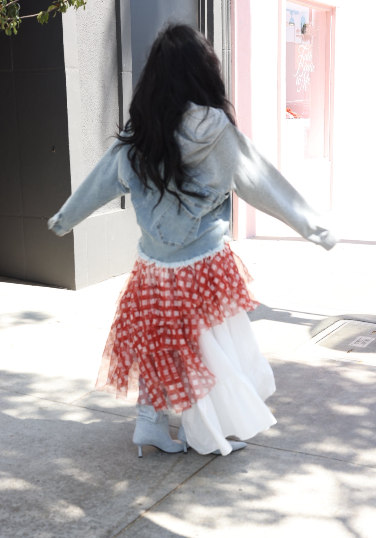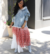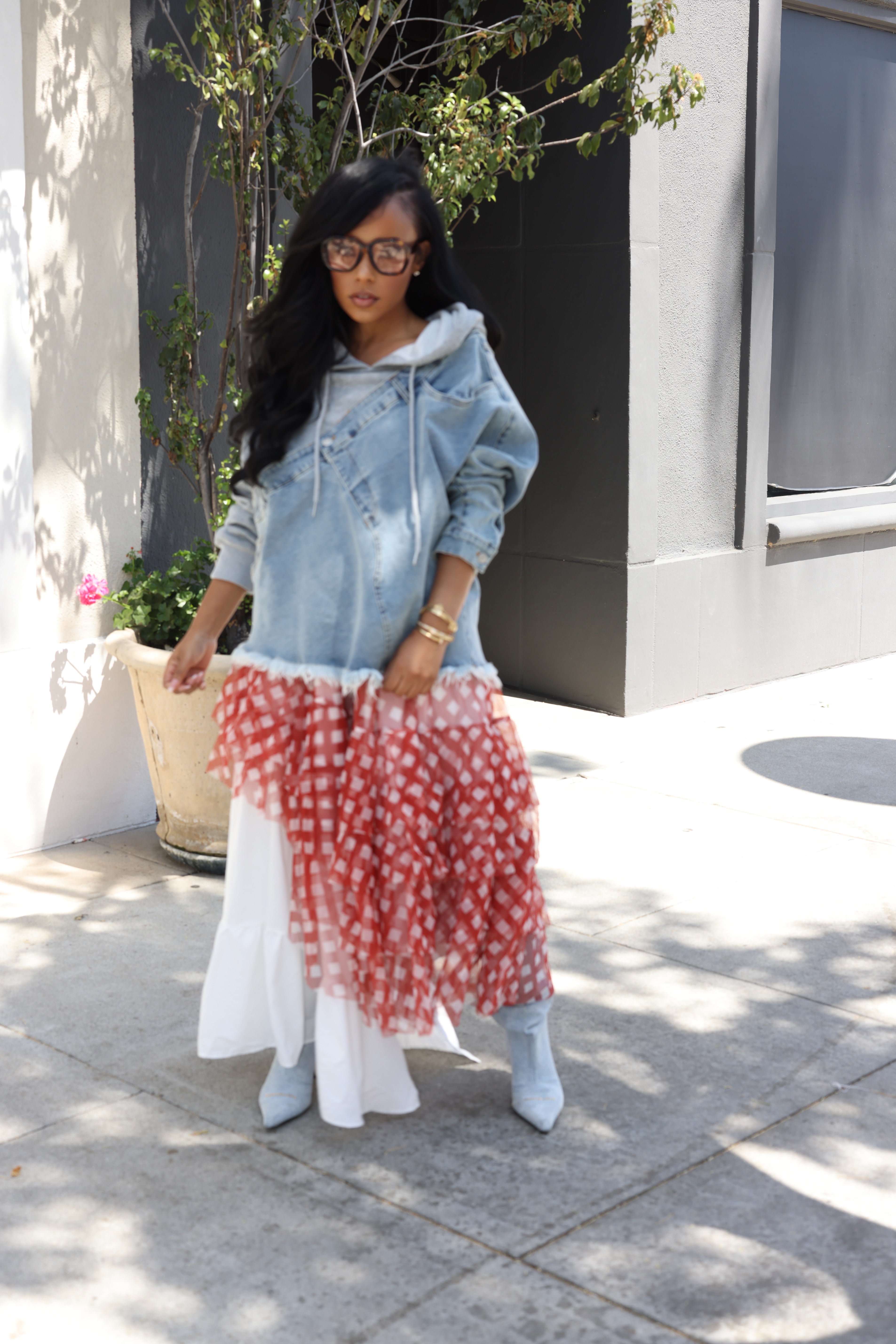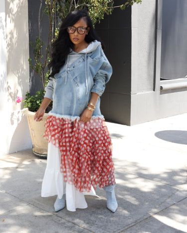 Effortlessly blending streetwear cool with high-fashion flair, this oversized hoodie redefines casual style. Crafted with a cozy heather-grey sweatshirt base, it’s elevated by an asymmetric distressed denim overlay that adds structure, texture, and instant attitude. The frayed hemline and raw edges give it an undone, editorial feel—perfect for layering over everything from flowing maxi skirts to leather leggings.