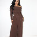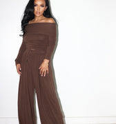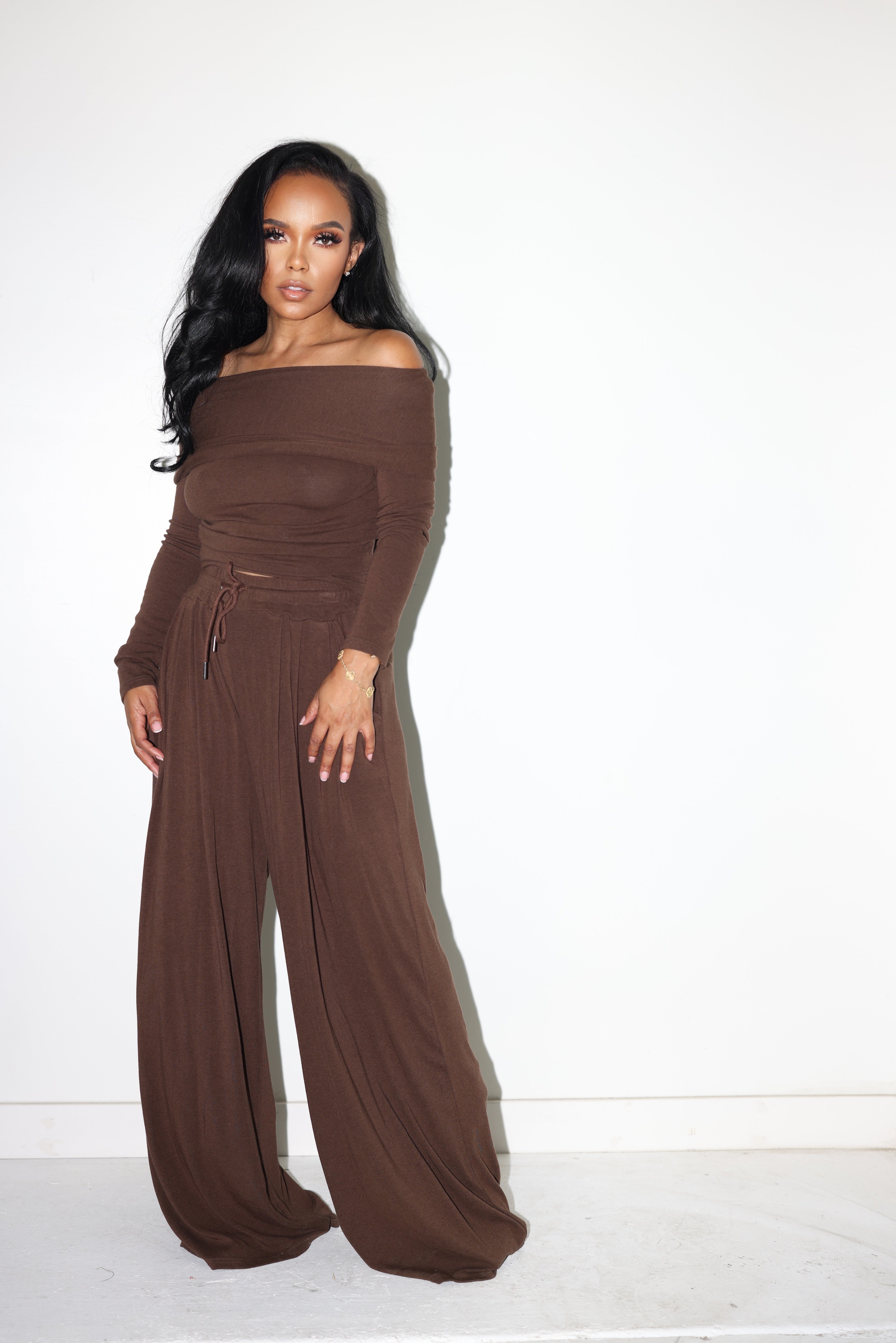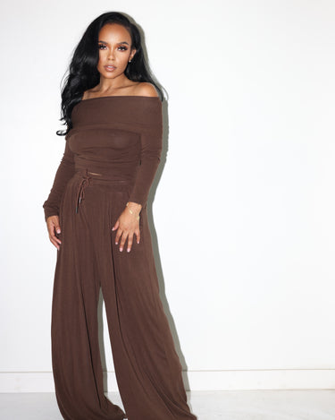 Slip into comfort without sacrificing style. The Effortless Luxe Set is crafted from a soft, breathable knit that drapes beautifully across the body. Featuring an off-the-shoulder long-sleeve top and wide-leg drawstring pants, this set redefines loungewear with an elevated edge.