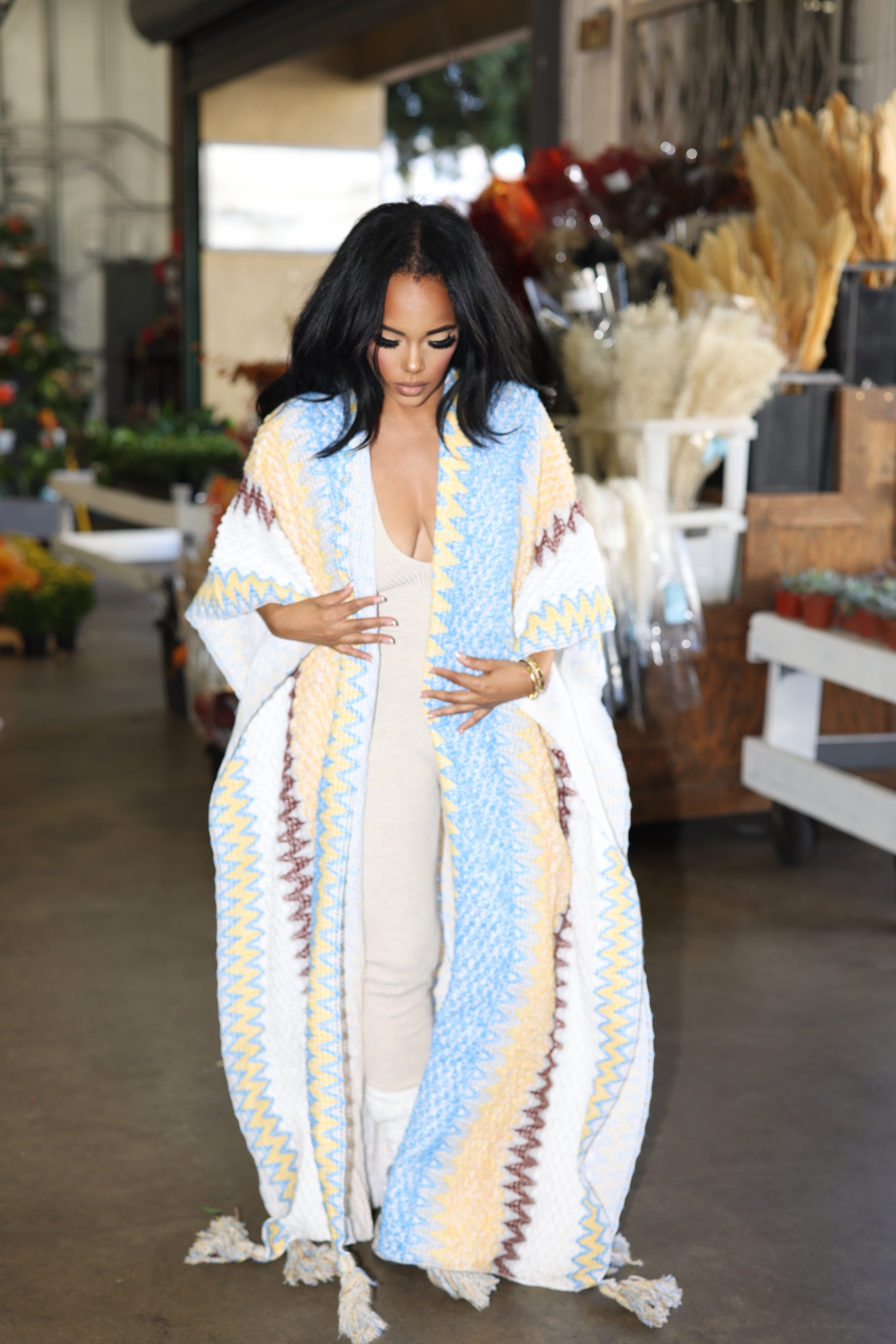 Wrap yourself in cozy, blanket‑soft comfort with this statement duster. Ankle‑grazing and effortlessly dramatic, it features a plush, textured knit with zig‑zag stripes in sky blue, butter yellow, ivory, and warm cocoa. Wide kimono sleeves and oversized tassels at the hem bring a touch of boho flair, while the open‑front silhouette layers beautifully over everything from ribbed jumpsuits to jeans and tees.
