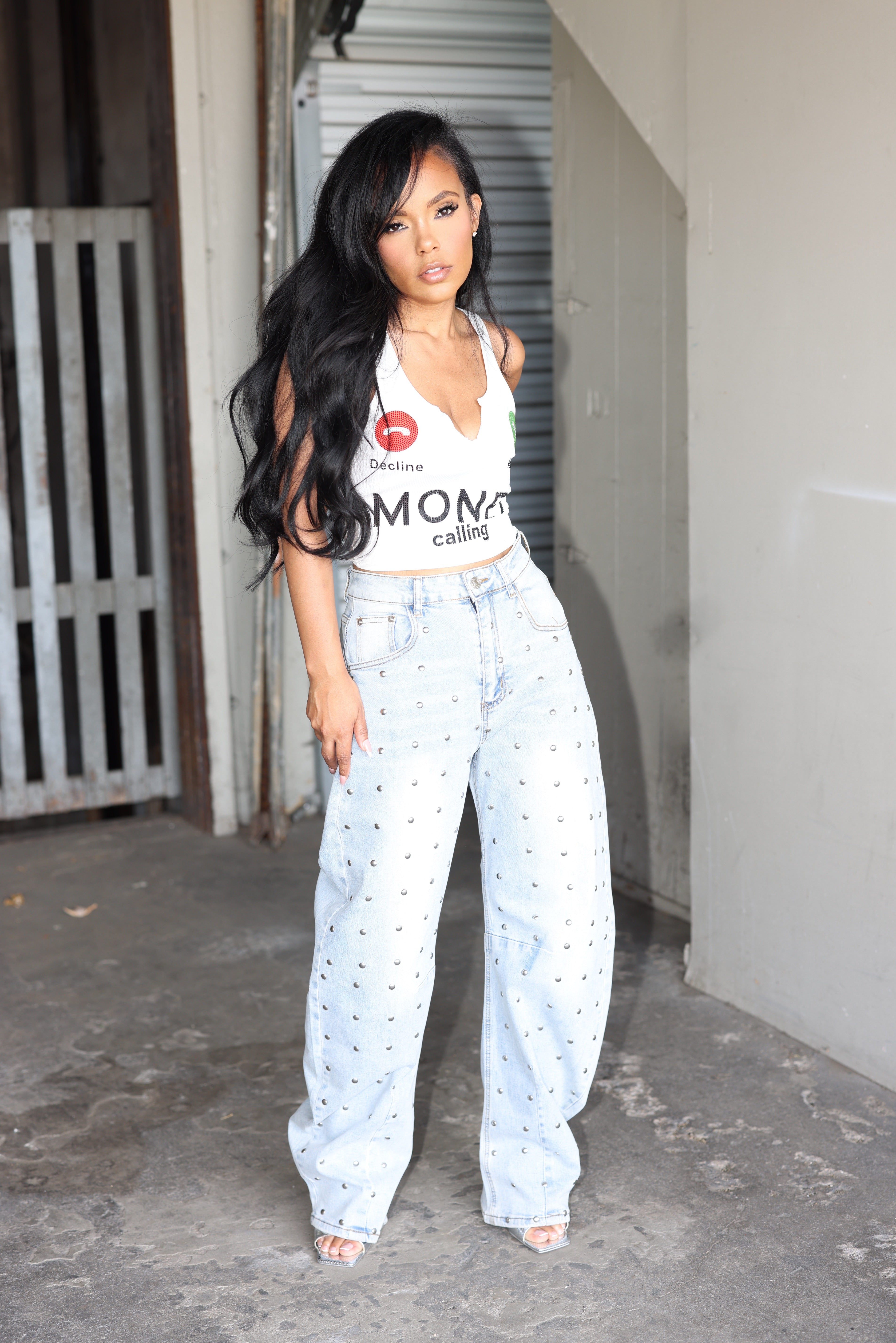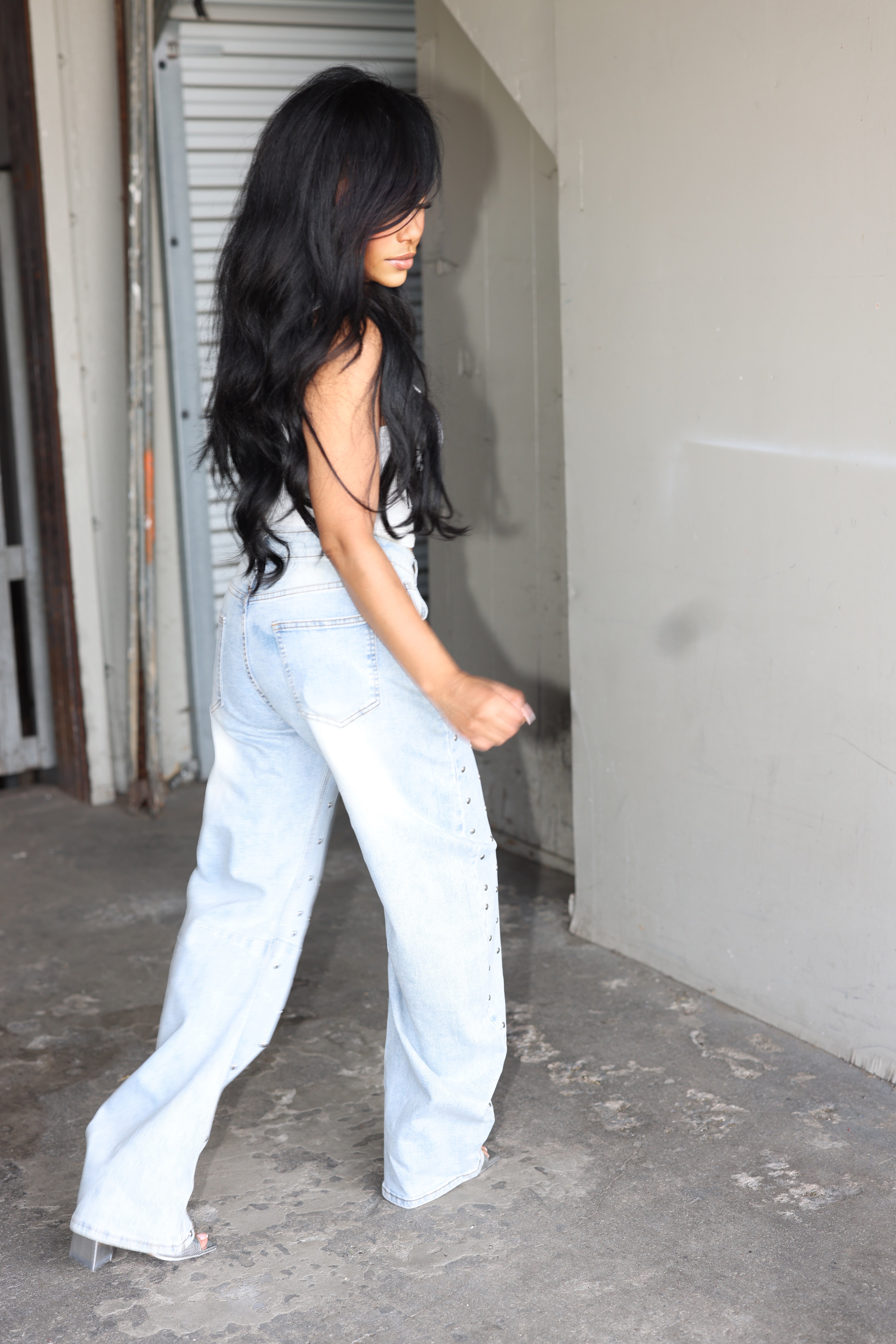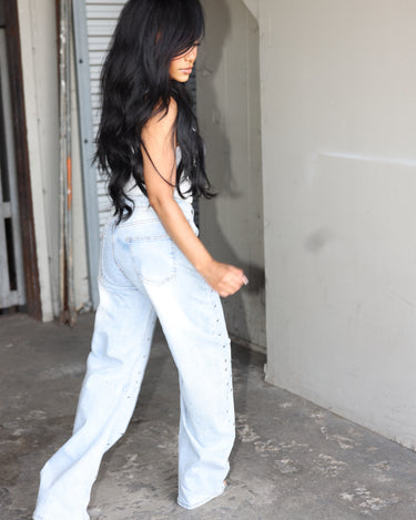 Elevate your denim game with these statement-making wide-leg jeans. Crafted in a soft, light-wash denim, the silhouette balances relaxed ease with high-fashion edge. Featuring an allover grommet eyelet detail, each pair catches the light and adds an unexpected pop of shine to your look. The high-rise waist cinches you in, while the wide-leg cut elongates the legs for that effortlessly cool vibe.