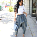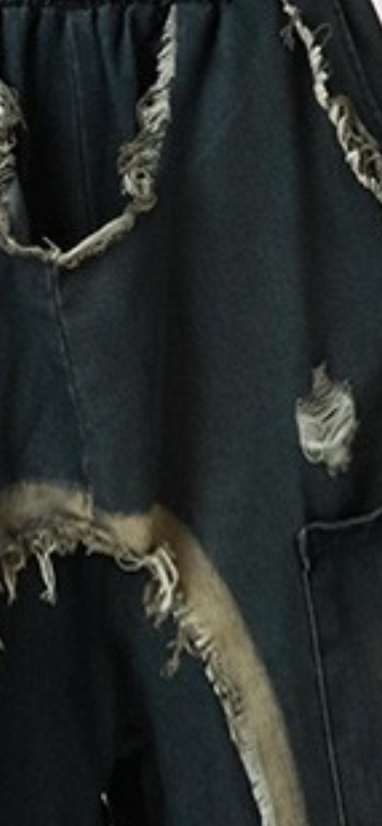 A whole attitude in one pair of pants. These distressed, ultra-oversized denim trousers are designed to make a statement — featuring dramatic raw-edged patchwork, exaggerated volume, and intentional chaos that somehow just works. The elastic waistband gives it that effortless pull-on feel, while the exaggerated silhouette commands attention from the sidewalk to the spotlight.
