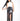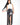 The set features a sleek halter-style white top with a gathered neckline, offering a clean, sophisticated silhouette that beautifully balances the drama of the skirt. The matching black wrap-style skirt is adorned with a bold white botanical print and finished with an ultra-luxe macramé fringe hemline that cascades to the floor, swaying with every step you take.