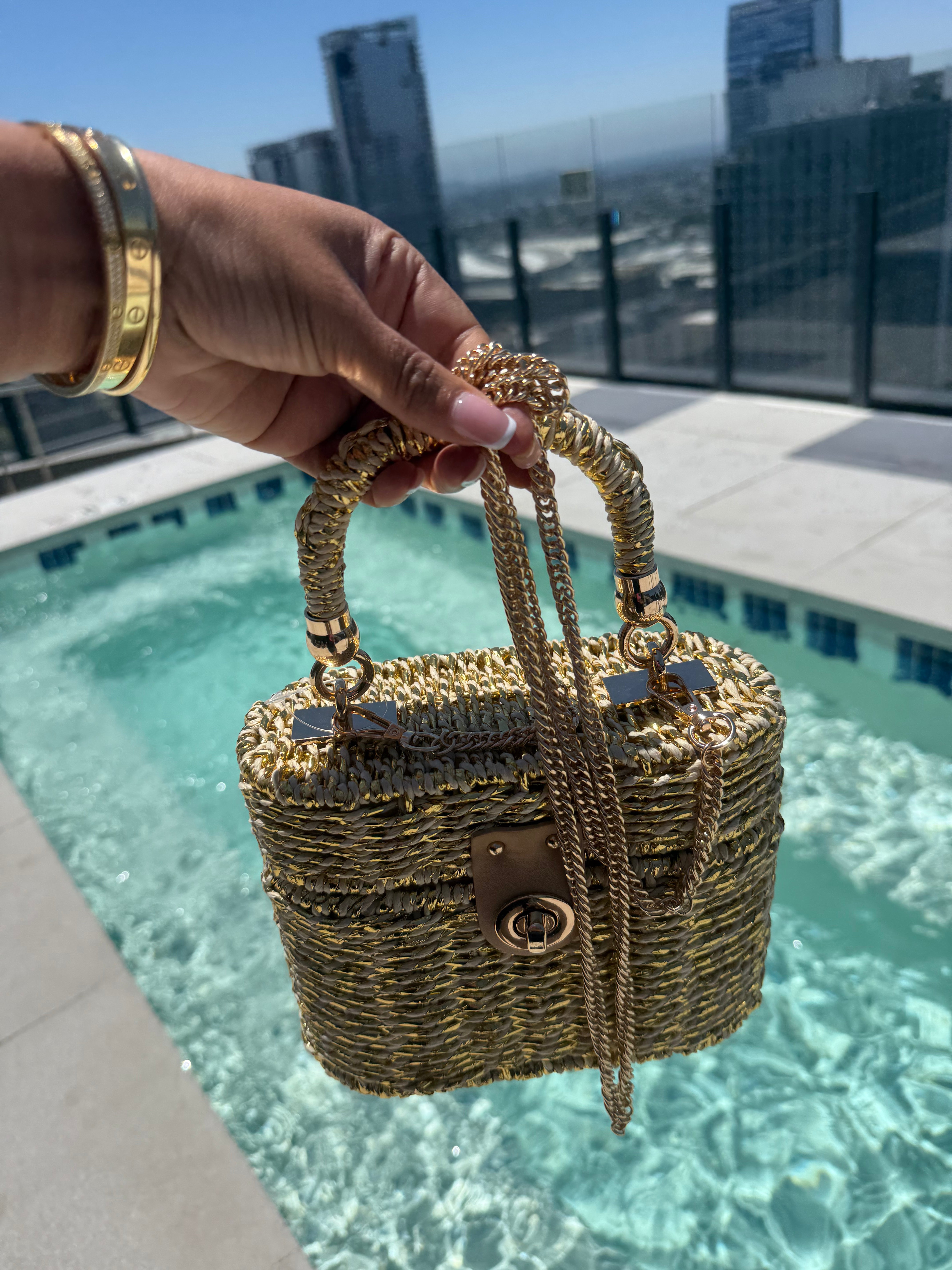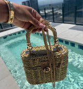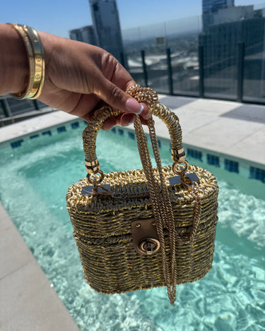 Meet your new summer obsession. The Golden Hour Woven Mini Bag is where poolside glam meets effortless luxury. Crafted from tightly woven straw with shimmering gold threads, this structured mini features a top handle and luxe gold hardware that catches every ray of sunlight. The turn-lock closure adds a timeless touch, while the detachable gold chain strap gives you styling versatility—carry it by hand or wear it crossbody as you sip cocktails under the sun.