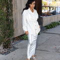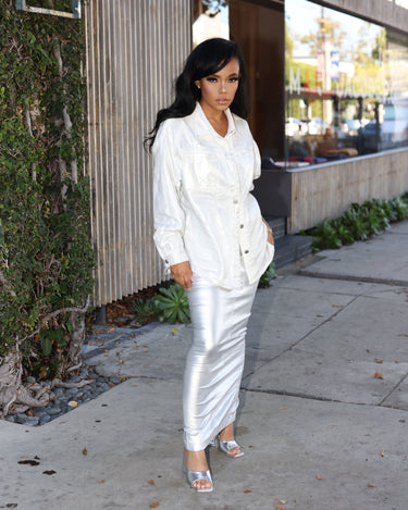 Command the spotlight in The Silver Lining Oversized Jacket — a statement piece that redefines street chic with a futuristic twist. Crafted in a luminous metallic finish, this structured yet relaxed-fit jacket brings the perfect blend of edge and elegance. Designed with classic denim-style details — front button closure, oversized chest pockets, and cuffed sleeves — it can be worn buttoned up for a sleek streetwear look or tied at the waist for a flirty, fashion-forward moment.