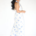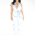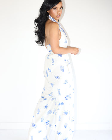 Slip into vacation mode with our Coastal Charm Halter Jumpsuit — where effortless elegance meets island vibes. This wide-leg silhouette features a plunging halter neckline and open back that feels as breezy as a seaside escape. Designed in a lightweight cream fabric with dreamy blue coastal illustrations — think seashells, palm trees, and ocean treasures — this piece instantly transports you to a summer state of mind.