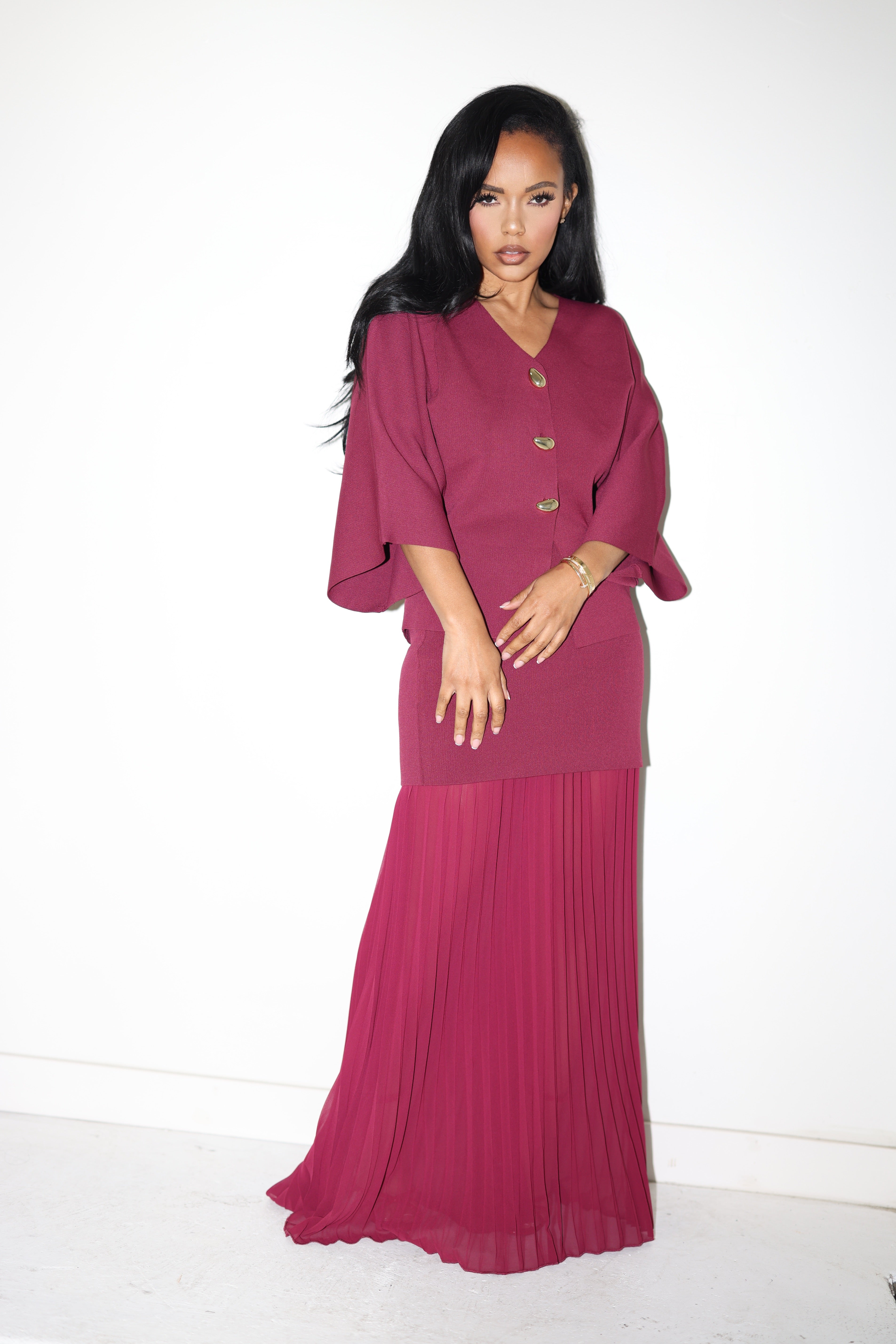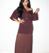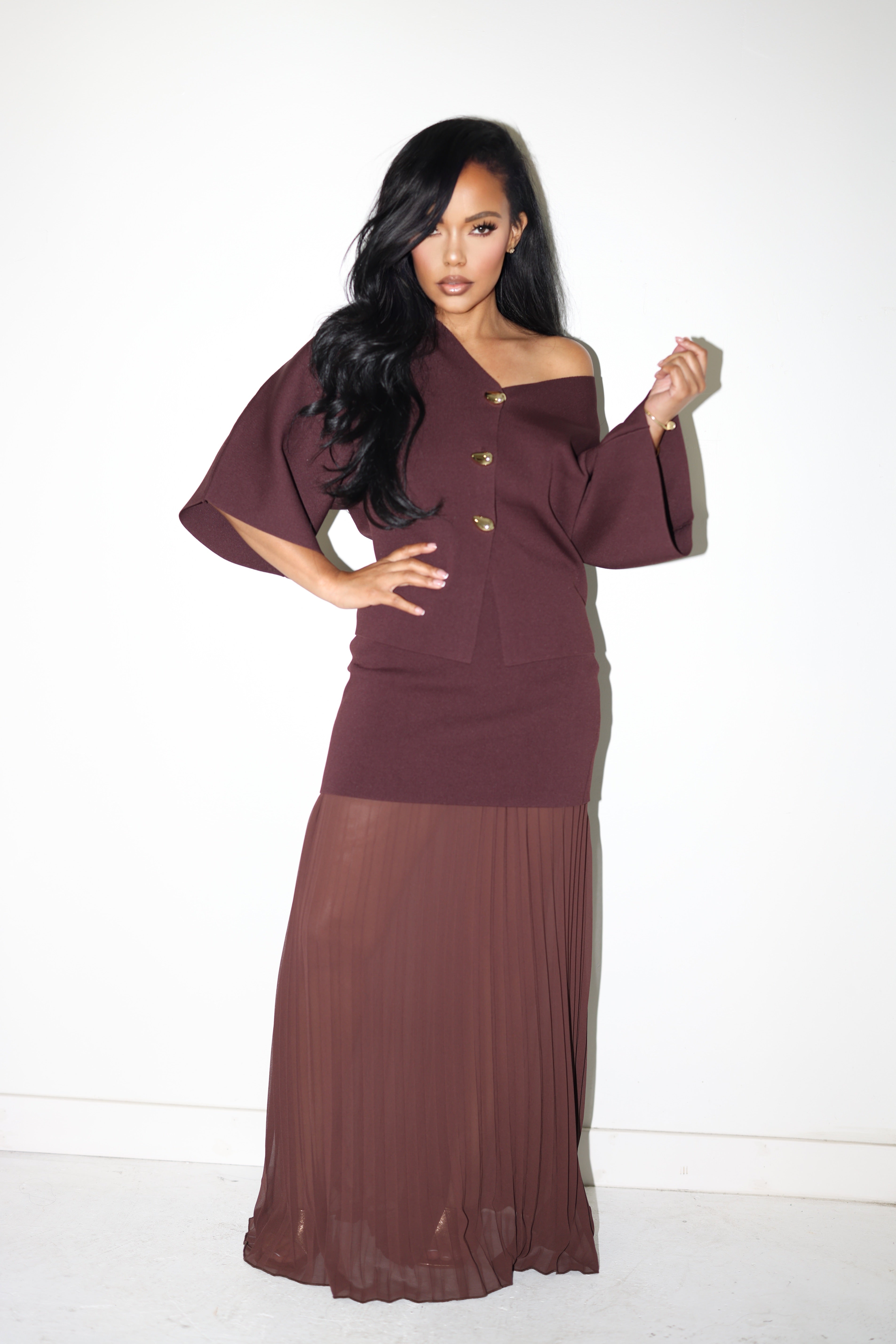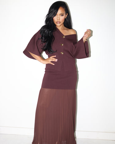 The top features a relaxed silhouette with wide statement sleeves and luxe gold-tone buttons, offering the option to wear it off one shoulder for an effortlessly sensual edge. The skirt’s lightweight pleats move gracefully with every step, creating an elegant contrast to the tailored knit texture.