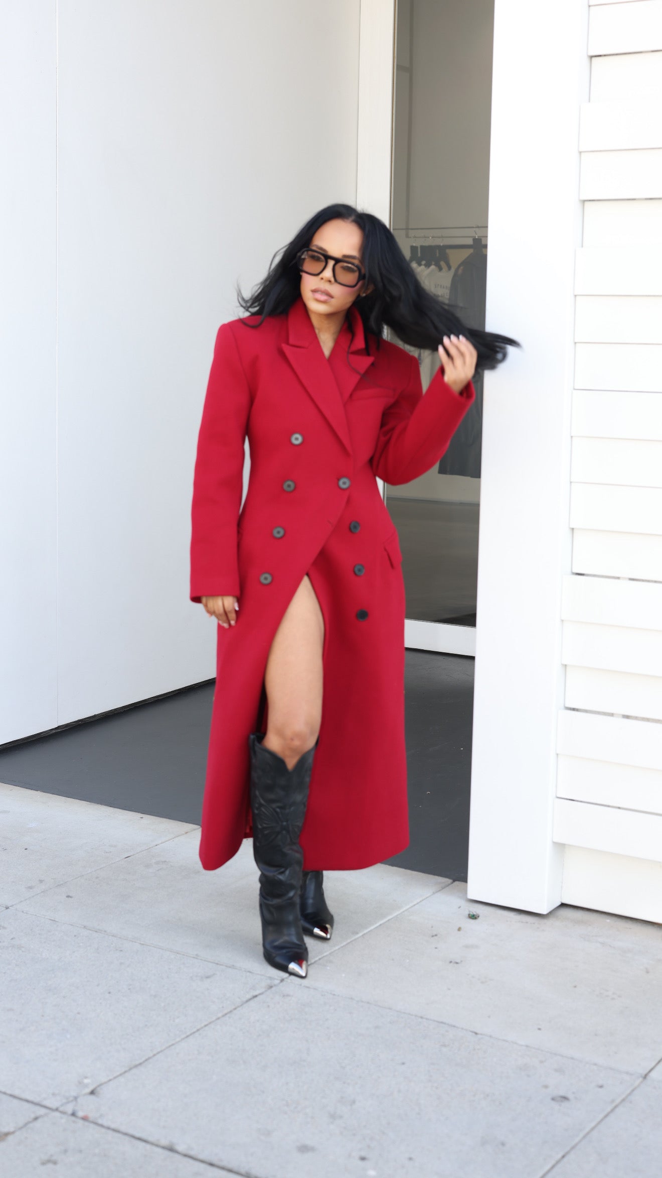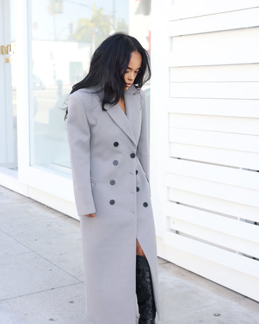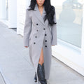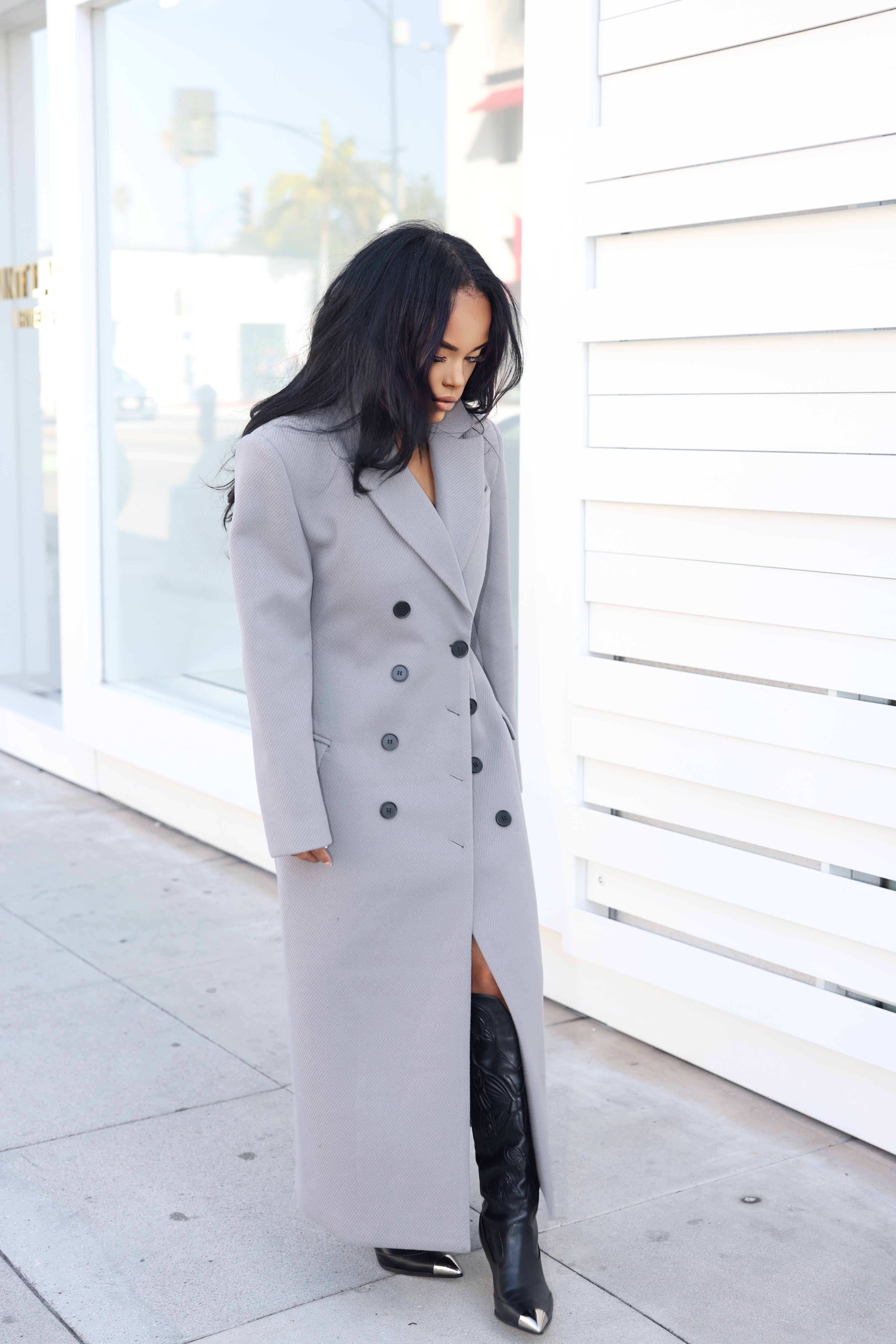 This full-length trench coat is a study in silent power. The sharply tailored silhouette, bold double-breasted buttons, and stormy oat-gray hue create a mood — one that says “don’t play with her.” Designed for both structure and sensuality, Storm Siren moves like a whisper but speaks volumes.