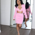 Step into elegance and exude confidence with the Barbie Set—a three-piece ensemble designed for the modern woman who commands attention. Featuring a cropped blazer with shimmering embellishments, a sultry bralette with a statement rhinestone buckle, and a sleek high-waisted pencil skirt, this set is the epitome of sophistication and femininity.
