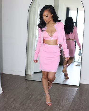 Crafted from premium stretch-knit fabric, the set contours your curves while providing a comfortable, tailored fit. Whether you’re making boss moves at brunch or turning heads at an exclusive event, this chic pink ensemble delivers effortless glamour. Pair it with your favorite heels and minimal accessories for a polished, runway-ready look.